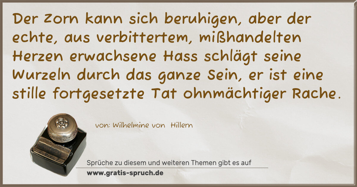 Der Zorn kann sich beruhigen, aber der echte, aus verbittertem, mißhandelten Herzen erwachsene Hass schlägt seine Wurzeln durch das ganze Sein, er ist eine stille fortgesetzte Tat ohnmächtiger Rache.