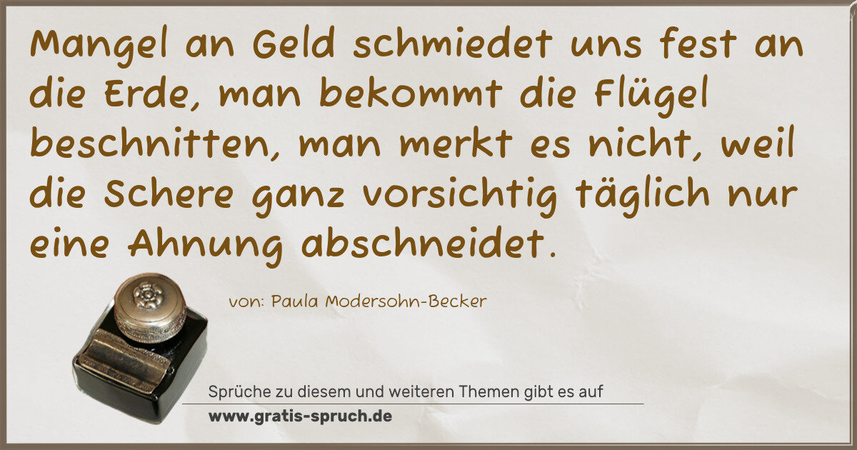 Mangel an Geld schmiedet uns fest an die Erde, man bekommt die Flügel beschnitten, man merkt es nicht, weil die Schere ganz vorsichtig täglich nur eine Ahnung abschneidet.
