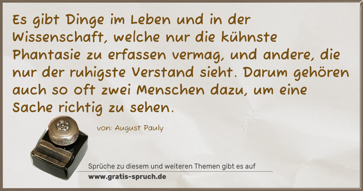 Es gibt Dinge im Leben und in der Wissenschaft, welche nur die kühnste Phantasie zu erfassen vermag, und andere, die nur der ruhigste Verstand sieht. Darum gehören auch so oft zwei Menschen dazu, um eine Sache richtig zu sehen.