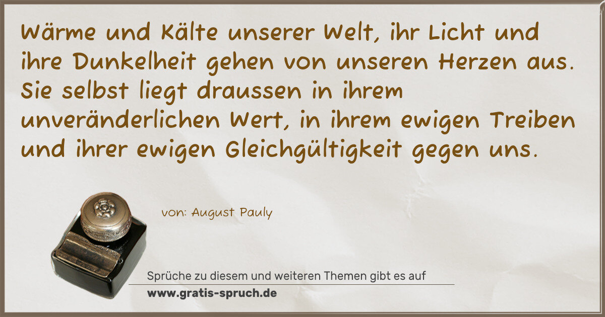 Wärme und Kälte unserer Welt, ihr Licht und ihre Dunkelheit gehen von unseren Herzen aus. Sie selbst liegt draussen in ihrem unveränderlichen Wert, in ihrem ewigen Treiben und ihrer ewigen Gleichgültigkeit gegen uns.