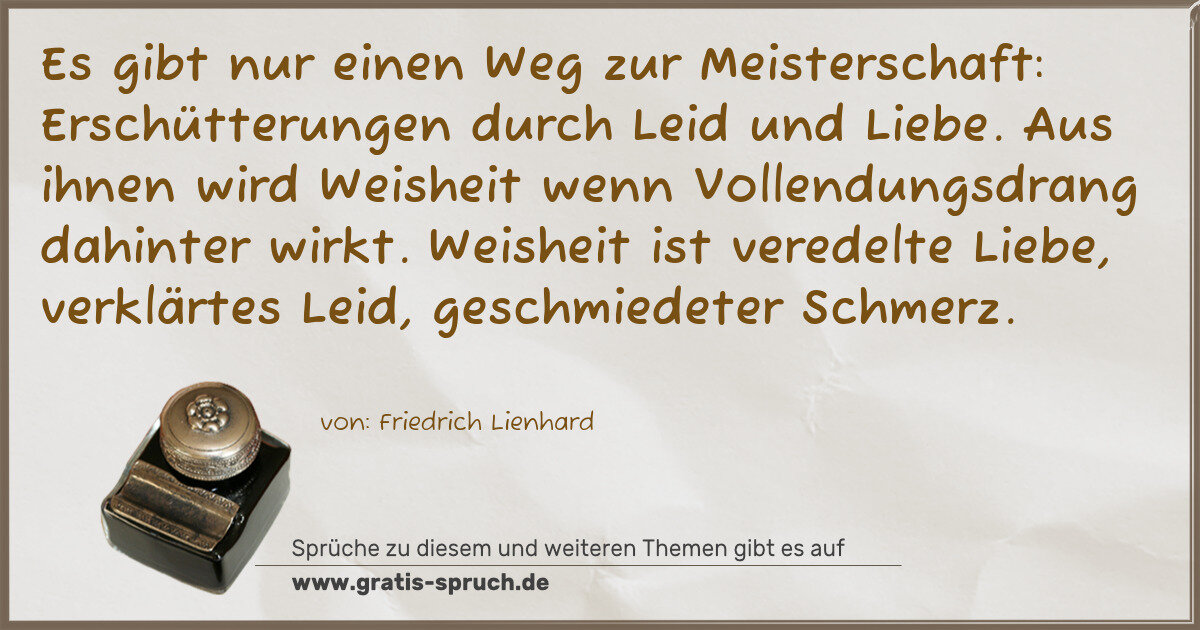 Es gibt nur einen Weg zur Meisterschaft: Erschütterungen durch Leid und Liebe. Aus ihnen wird Weisheit wenn Vollendungsdrang dahinter wirkt. Weisheit ist veredelte Liebe, verklärtes Leid, geschmiedeter Schmerz.