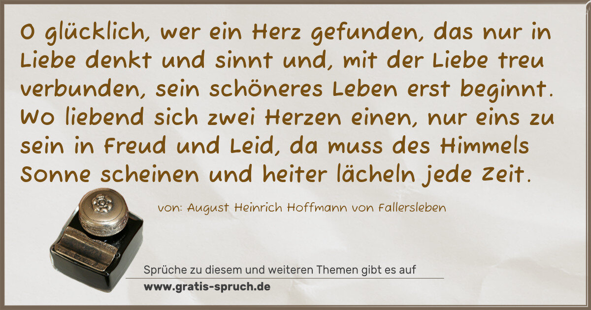 O glücklich, wer ein Herz gefunden, das nur in Liebe denkt und sinnt und, mit der Liebe treu verbunden, sein schöneres Leben erst beginnt. Wo liebend sich zwei Herzen einen, nur eins zu sein in Freud und Leid, da muss des Himmels Sonne scheinen und heiter lächeln jede Zeit.