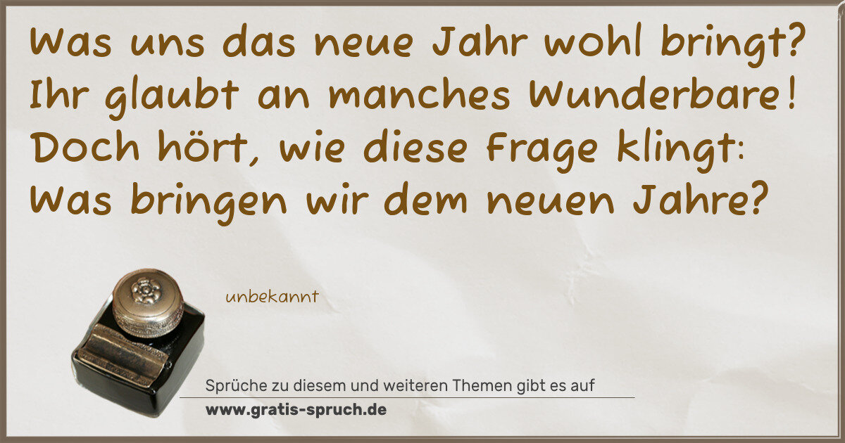 Was uns das neue Jahr wohl bringt? Ihr glaubt an manches Wunderbare! Doch hört, wie diese Frage klingt: Was bringen wir dem neuen Jahre?