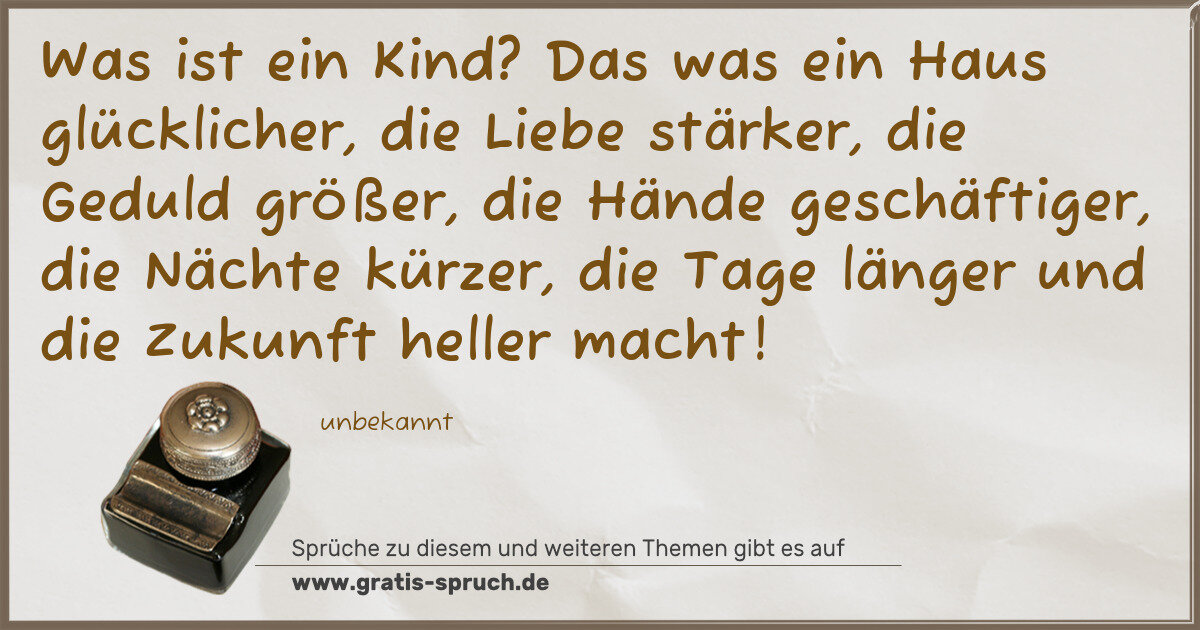 Was ist ein Kind? Das was ein Haus glücklicher, die Liebe stärker, die Geduld größer, die Hände geschäftiger, die Nächte kürzer, die Tage länger und die Zukunft heller macht!