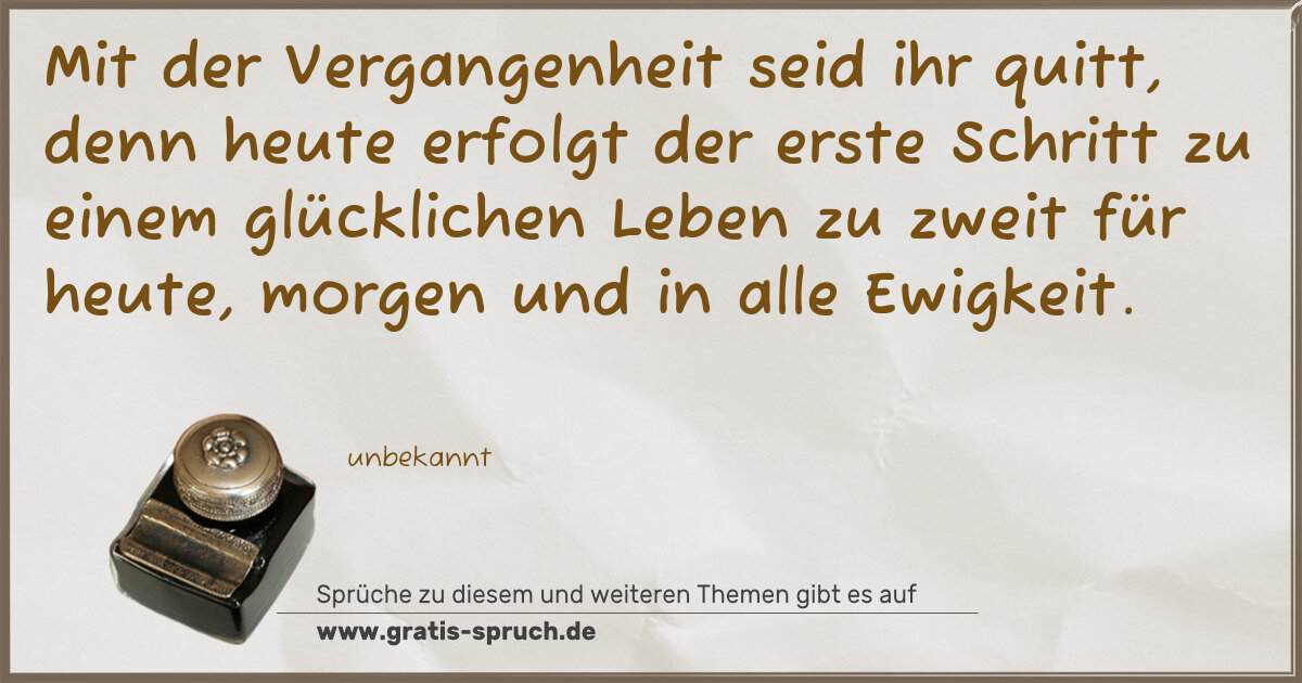 Mit der Vergangenheit seid ihr quitt, denn heute erfolgt der erste Schritt zu einem glücklichen Leben zu zweit für heute, morgen und in alle Ewigkeit.