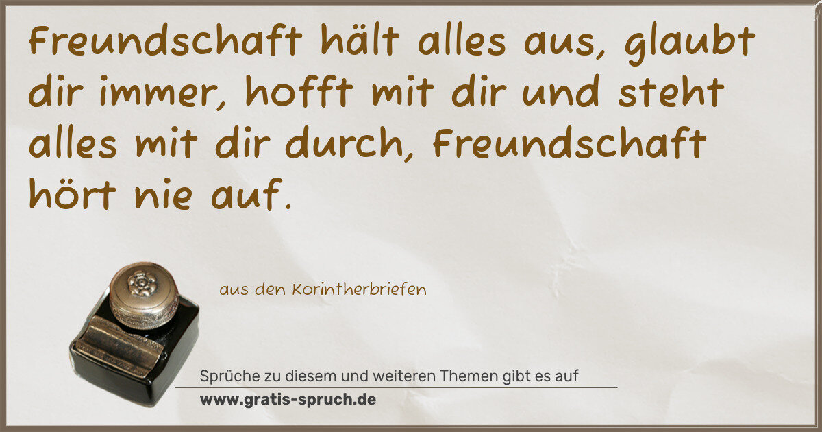 Freundschaft hält alles aus, glaubt dir immer, hofft mit dir und steht alles mit dir durch, Freundschaft hört nie auf.