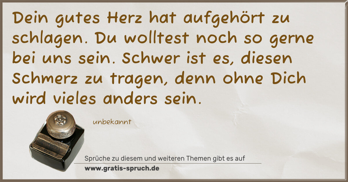 Dein gutes Herz hat aufgehört zu schlagen. Du wolltest noch so gerne bei uns sein. Schwer ist es, diesen Schmerz zu tragen, denn ohne Dich wird vieles anders sein.