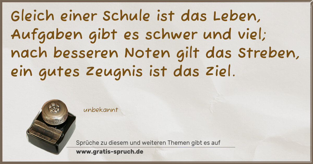Gleich einer Schule ist das Leben, Aufgaben gibt es schwer und viel; nach besseren Noten gilt das Streben, ein gutes Zeugnis ist das Ziel.