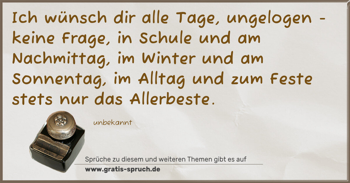Ich wünsch dir alle Tage, ungelogen - keine Frage, in Schule und am Nachmittag, im Winter und am Sonnentag, im Alltag und zum Feste stets nur das Allerbeste.