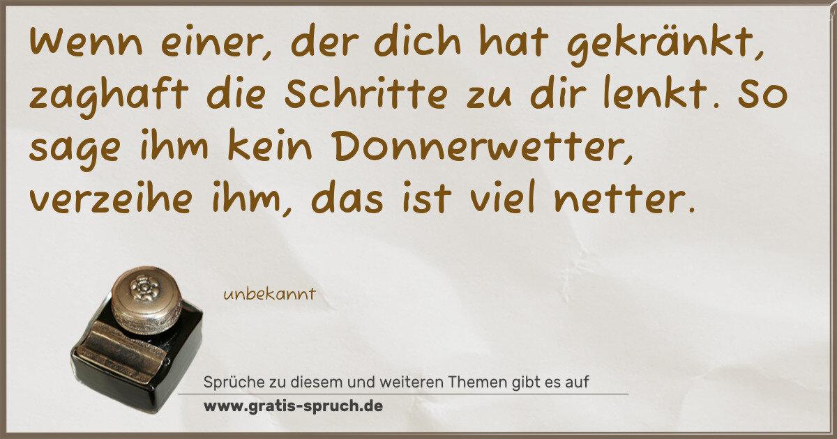 Wenn einer, der dich hat gekränkt, zaghaft die Schritte zu dir lenkt. So sage ihm kein Donnerwetter, verzeihe ihm, das ist viel netter.