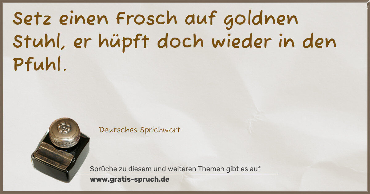 Setz einen Frosch auf goldnen Stuhl, er hüpft doch wieder in den Pfuhl.