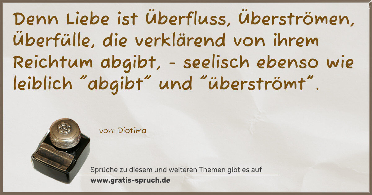 Denn Liebe ist Überfluss, Überströmen, Überfülle, die verklärend von ihrem Reichtum abgibt, - seelisch ebenso wie leiblich "abgibt" und "überströmt".