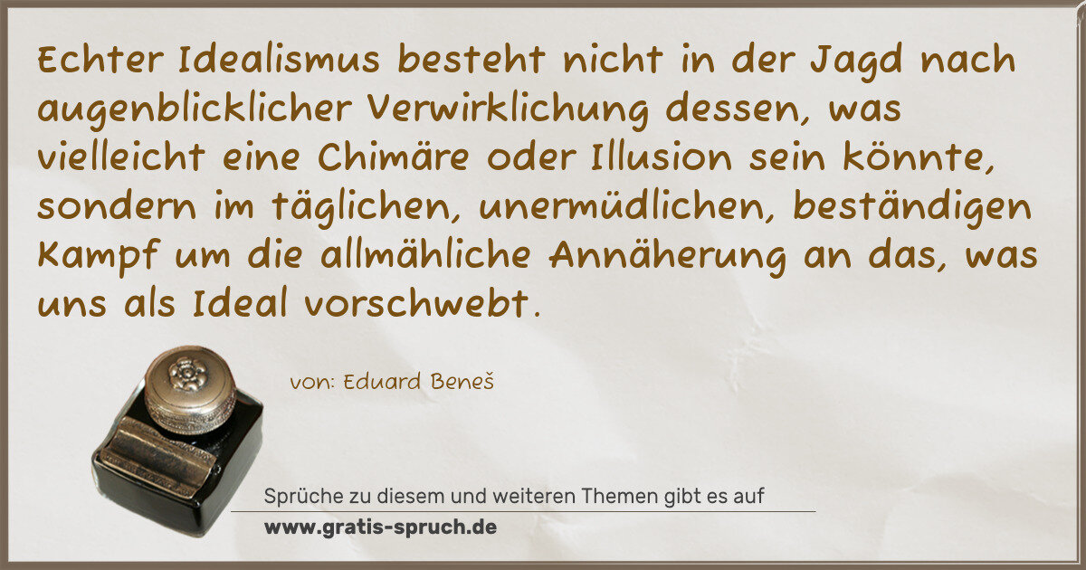 Echter Idealismus besteht nicht in der Jagd nach augenblicklicher Verwirklichung dessen, was vielleicht eine Chimäre oder Illusion sein könnte, sondern im täglichen, unermüdlichen, beständigen Kampf um die allmähliche Annäherung an das, was uns als Ideal vorschwebt.