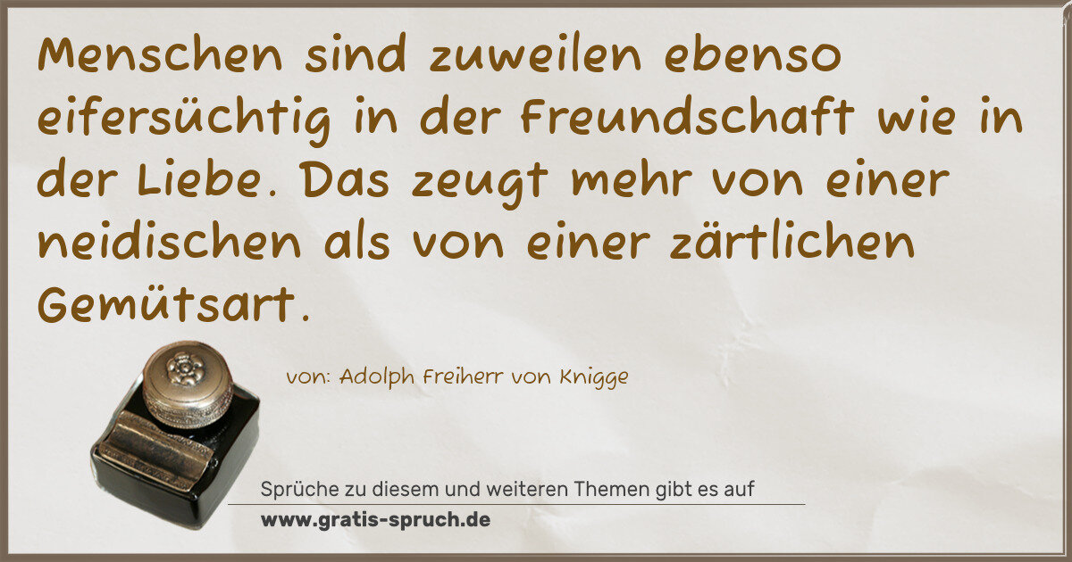 Menschen sind zuweilen ebenso eifersüchtig in der Freundschaft wie in der Liebe. Das zeugt mehr von einer neidischen als von einer zärtlichen Gemütsart.