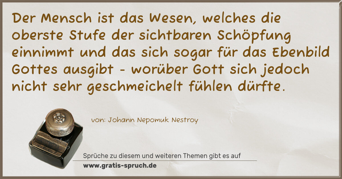 Der Mensch ist das Wesen, welches die oberste Stufe der sichtbaren Schöpfung einnimmt und das sich sogar für das Ebenbild Gottes ausgibt - worüber Gott sich jedoch nicht sehr geschmeichelt fühlen dürfte.