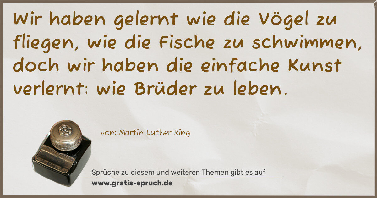 Wir haben gelernt wie die Vögel zu fliegen, wie die Fische zu schwimmen, doch wir haben die einfache Kunst verlernt: wie Brüder zu leben.