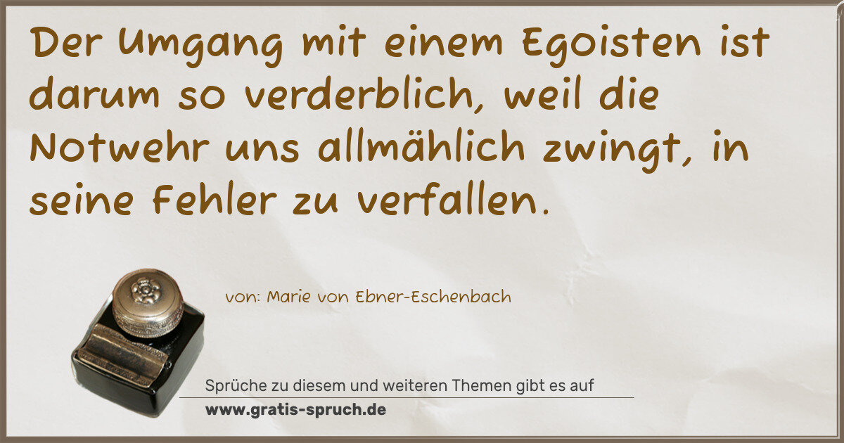 Der Umgang mit einem Egoisten ist darum so verderblich, weil die Notwehr uns allmählich zwingt, in seine Fehler zu verfallen.